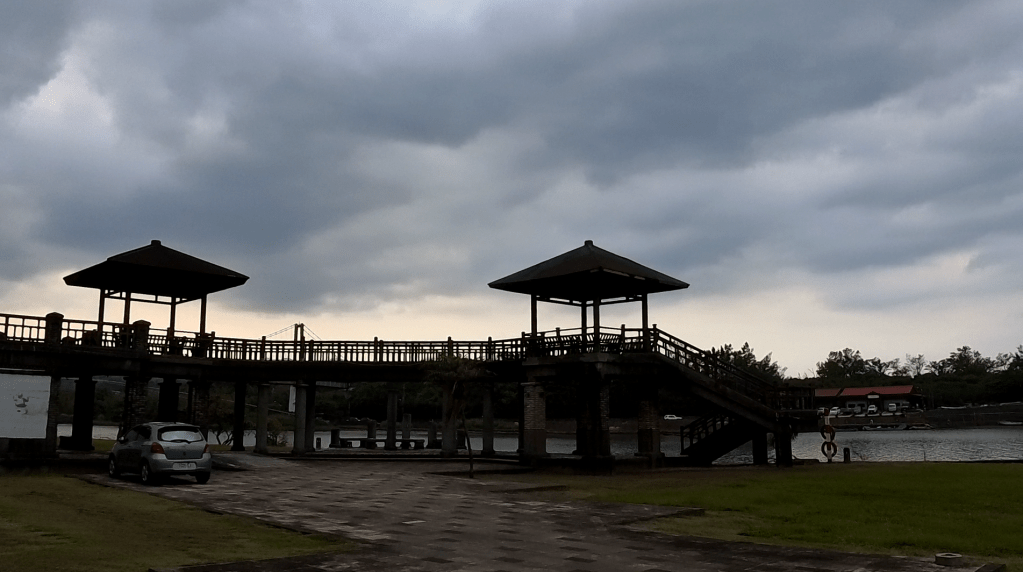 我們先在營區周邊的河濱公園區和龍門吊橋散步,這一帶綠意盎然,河岸風景很舒服。吊橋本身不長,但走在橋上時,風輕輕吹來,視野一下子開闊起來。往遠方一看,還能隱約看到福隆海水浴場的海岸線。這種融合山海、河景、海景、沙灘的營區,讓人一秒放空。