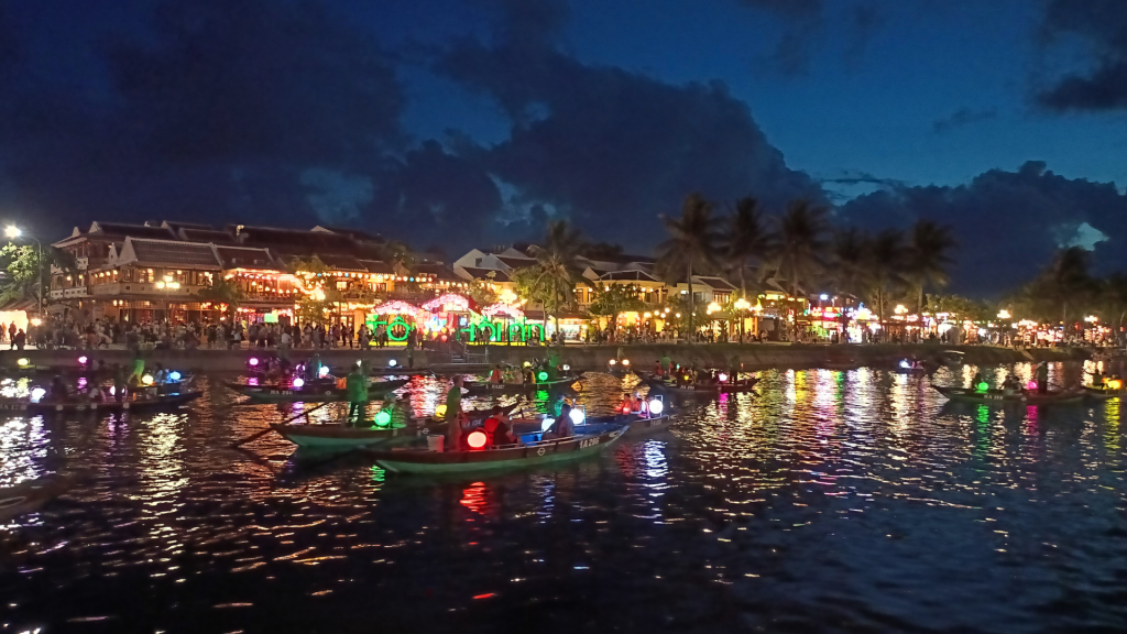 當夕陽逐漸西沉,會安古鎮也悄悄換上屬於夜晚的浪漫氣息。而這一切的魔法,就從秋盆河的遊船與放燈籠體驗開始。搭上一艘由當地人手搖的小木船,隨著波光粼粼的河面慢慢前行,兩岸彩色燈籠倒映在水中,彷彿進入東方童話世界。