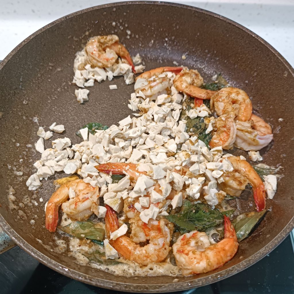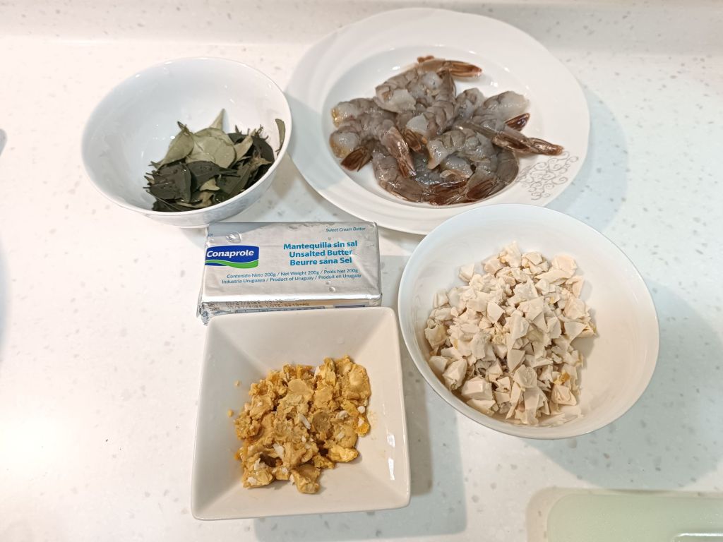 將熟鹹蛋黃、蛋白分開,蛋黃用叉子壓碎成細末(越細越好包裹)。蛋白切丁。利用香煎蝦子鍋中的奶油,小火炒咖喱葉。炒出香氣後加入蛋黃碎,維持小火慢炒,你會看到蛋黃開始起泡、顆粒變得乾鬆像沙子。此時加入蛋白丁,快速拌匀讓香氣更厚。炒到聞到很濃的鹹蛋黃香就先關小火。