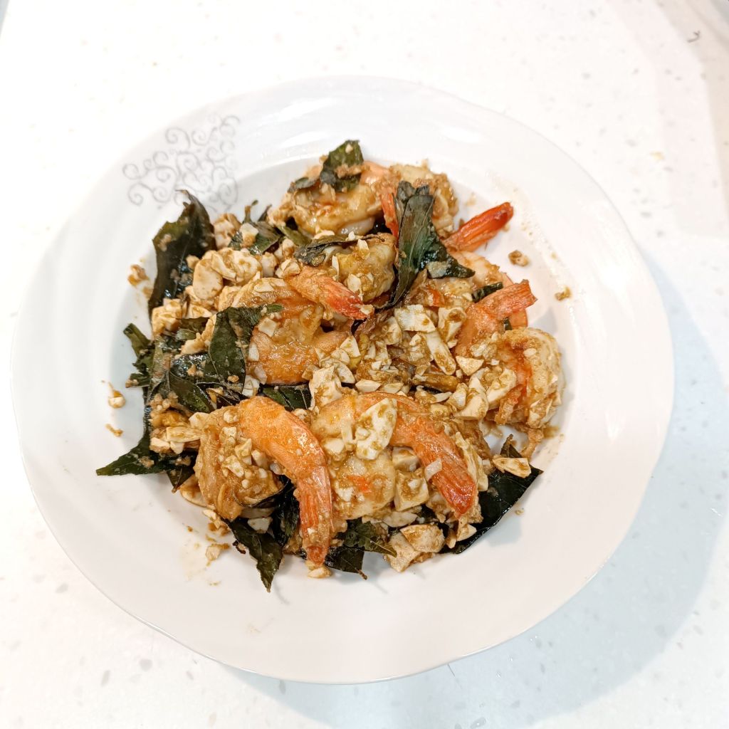 把煎好的蝦子倒回金沙鍋,開小火快速翻拌 20–40 秒,讓每隻蝦都均勻裹上金沙。若覺得偏乾,可補 1 小匙水或牛奶「點一下」讓金沙更服貼,但不要加多,避免變成濕糊。香氣出來後,就大功告成了!